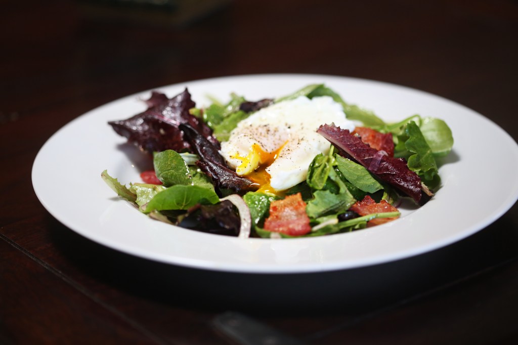 When the eggs are almost done, toss the bacon in the bowl with the greens and add enough vinaigrette to coat the leaves well – you may not need the whole recipe and less is more – an over dressed salad gets soggy and gross really quick.