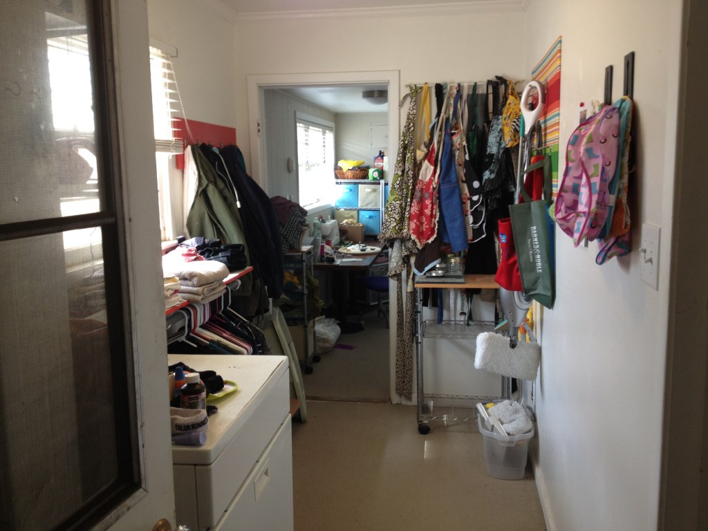 What if THIS greeted you every time you came home? Would you feel like working? All those things hanging on a curtain rod are aprons. Yeah, I have plenty. I gave a lot away and kept the ones people made for me. De-clutter! I’m the antithesis of a hoarder. If it doesn’t get used in a year, it gets given away or thrown out.