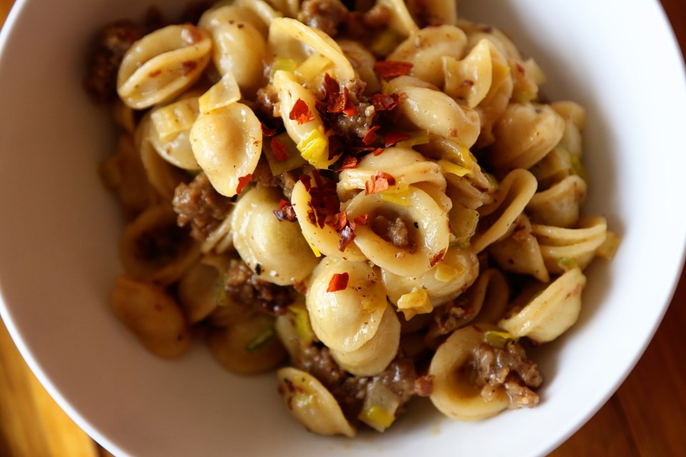 I created this little pasta dish with ground smokey sausage, sauteed leeks and crushed red pepper.  A pretty classic combination but with that smokey sausage, it takes it to a new level.  The orecchiette pasta was perfect for holding little bits of sausage and leek – this is a fast dinner that is completely satisfying and easy to throw together after work.  After you try this sausage, you will keep one on hand at all times.