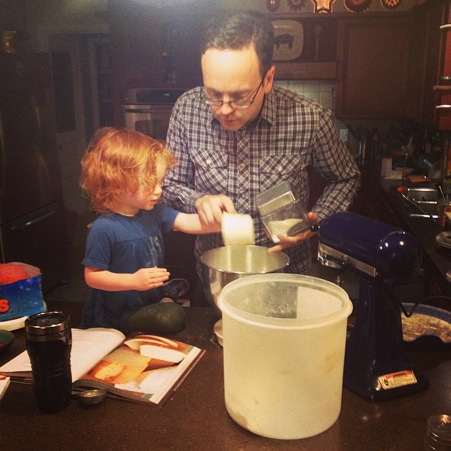 In a large bowl, combine the milk, 1/2 cup melted butter, flour, yeast, eggs, agave and salt and whisk until smooth. Cover with plastic wrap and let stand until the batter is very puffy, about 2 hours at room temperature (or refrigerate overnight, which is what we did since we wouldn’t be using it first thing in the morning).