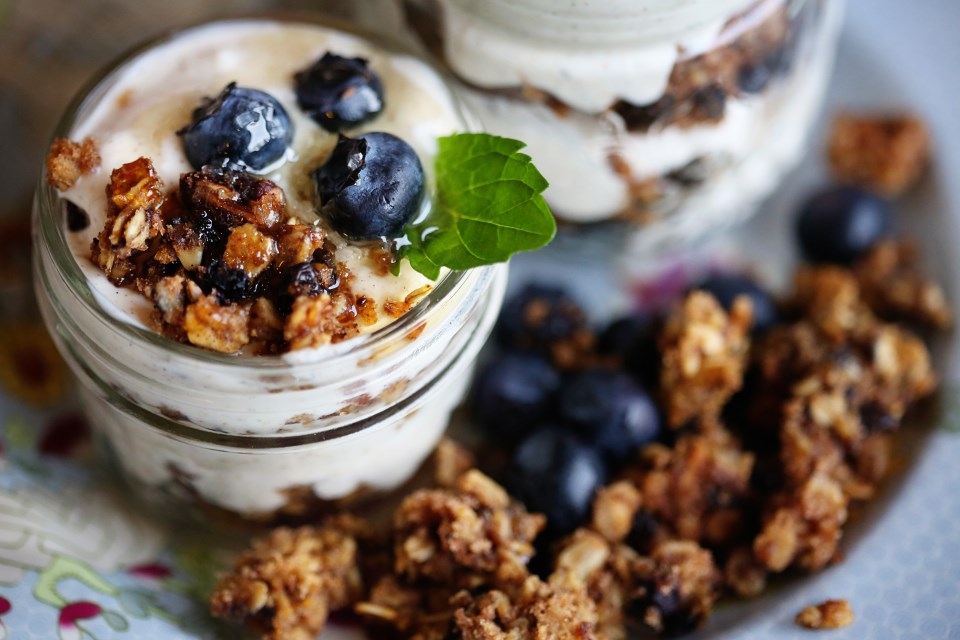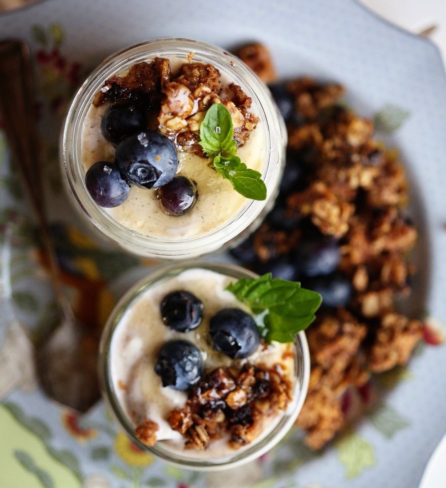 Mix all ingredients together and whip up until fully blended. Layer in cute little jars with the granola and top with fresh berries for the snack pictured here! Garnishing with mint adds a wonderful flavor addition and brightens everything up.