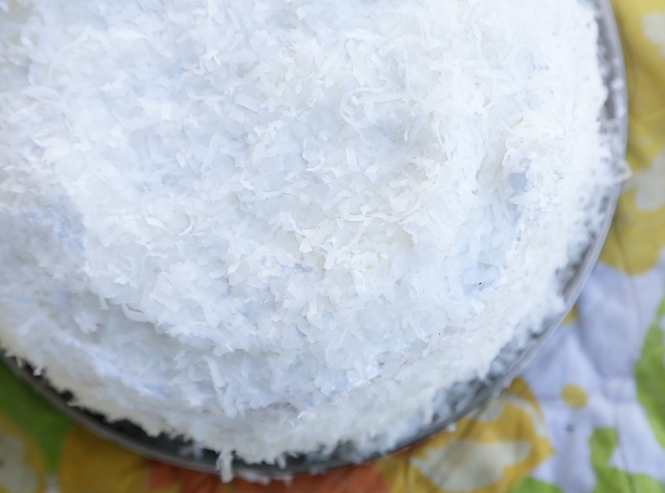 Assemble the cake: Place one cake layer on a cake stand and spread 3 cups meringue over cake; sprinkle with ¼ cup coconut. Repeat with second layer. Place remaining layer on top; cover top and sides with remaining meringue and cover outside of cake with remaining coconut, pressing lightly to adhere. Chill cake 30 minutes to firm meringue; serve chilled or at room temperature.