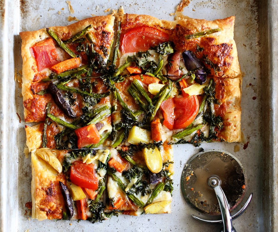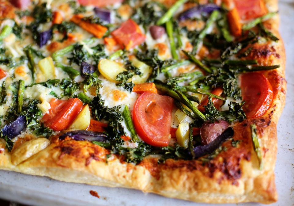 On a rimmed baking sheet, spray with oil and lay out your puff pastry to thaw.  When thawed enough to unfold, spread it out and roll it out bigger on each side to be about 1″ longer all the way around.  Spread your sauce and then sprinkle the cheese to cover it well.  Arrange your vegetables and coat the kale in a little bit of olive oil and rub it into the leaves to soften them up.  Bake in a 400F oven for 15-20 minutes until golden brown.