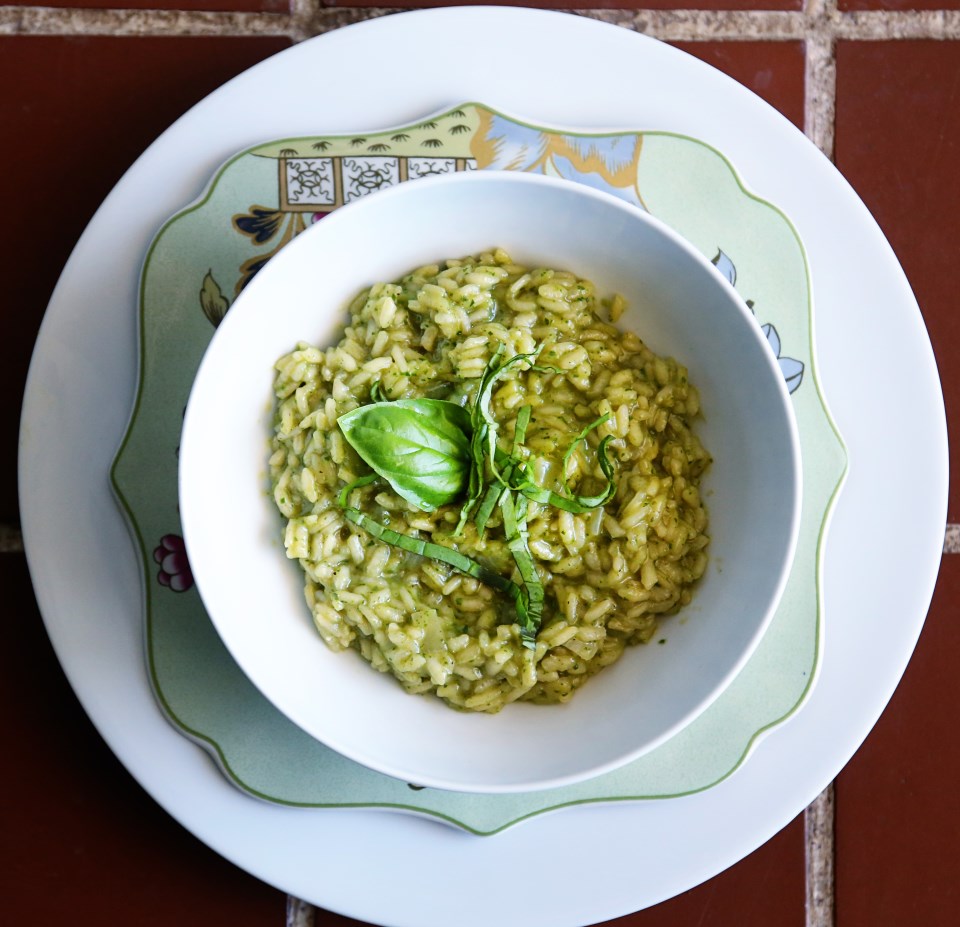 In a large, deep skillet over medium heat, melt the butter until it starts to bubble and then saute the onion and garlic until soft, stirring to not let the garlic burn.  Stir in the rice and stir to fully coat in the butter and onion.  Begin adding 1/2 cups of stock to the pan, stirring pretty regularly to ensure the rice doesn’t stick to the bottom of the pan.  When the liquid cooks off, add another 1/2 cup and keep this process up until you’re down to about a cup of stock and have been cooking it for at least 20 minutes.  Near the end, taste the rice – you don’t want it crunchy, but you don’t want it mushy either.  Think of it like pasta – a nice bite to it is key.  Stir in another half cup of stock if you think it could use it and then add in the basil paste.  Remove pan from the heat and serve immediately.  Garnish with fresh basil or a grating of fresh Parmesan and cracked pepper.