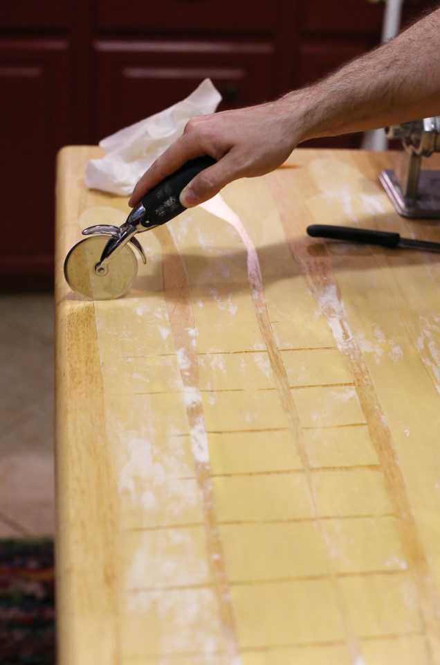 After rolling out the dough, for tortellini, cut into about 1.5″ squares. It doesn’t have to be perfect and a good pizza cutter makes it super easy.