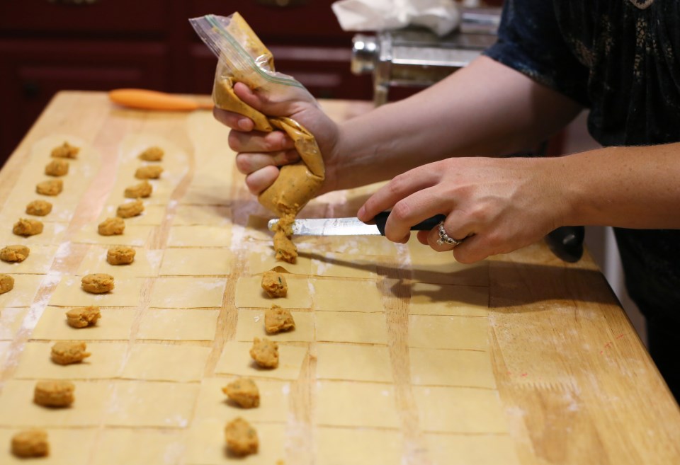 This pasta is a yearly tradition that Matt generally does at the beginning of the fall season. The classic combination of roasted pumpkin and sage is glorified with browned butter and served simply with a shaving of fresh Parmesan and a side of crusty bread. This year, we dipped into the all-encompassing guide to Italian cooking, Essentials of Classic Italian Cooking, by Marcella Hazan, for the recipe for the filling, which actually called for sweet potato instead of pumpkin (you can literally not taste the difference and the texture was great). We also use her recipe for our pasta dough and it is velvety and amazing every time. Making pasta from scratch is time consuming, but as we often do on the weekends, we incorporate the process of making the meal into our entertainment as well as our dinner. I’ve included step by step photos of how to cut and fill the dough and for rolling it out, we have this hand-crank pasta machine. It works great because I don’t feel like I can ever get pasta thin enough just rolling it out by hand. I’m no Italian grandmother.
