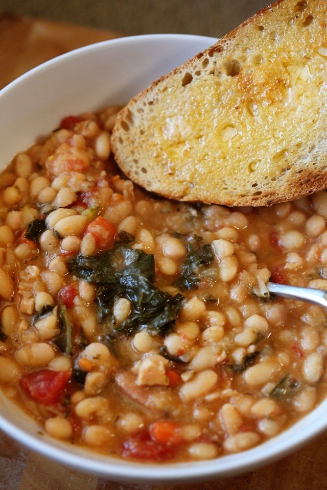 The one thing I DO love about cold weather is the food. I love making a huge pot of beans and eating it over the following days in various ways. Over cornbread, with smoked sausage, in a quesadilla, with a fried egg, whatever, it’s all good. And this most recent batch of stew we made was my favorite. Because Matt made it. Seriously, though, we both make our beans in the same way and much in the spirit of the Family Meal Blog, I always love when a recipe is made by someone else in this family. This stew also does my most favorite thing in the entire kitchen-world: it uses up leftovers! We threw in a half used can of diced tomatoes, a handful of kale, onion, and some leftover turkey and sausage from a local bbq joint and it was frankly, amazing. The beauty of a good bean stew is that you can add anything and if the beans are good, you’re good to go. For this, I recommend using dried beans instead of canned, although canned would cut the prep/cook time by a good 8 hours. They just don’t have the depth of flavor that starting with dried beans does. And because we’re a part of Rancho Gordo’s Bean of the Month Club, (yes) I recommend you get their beans if you can find them!