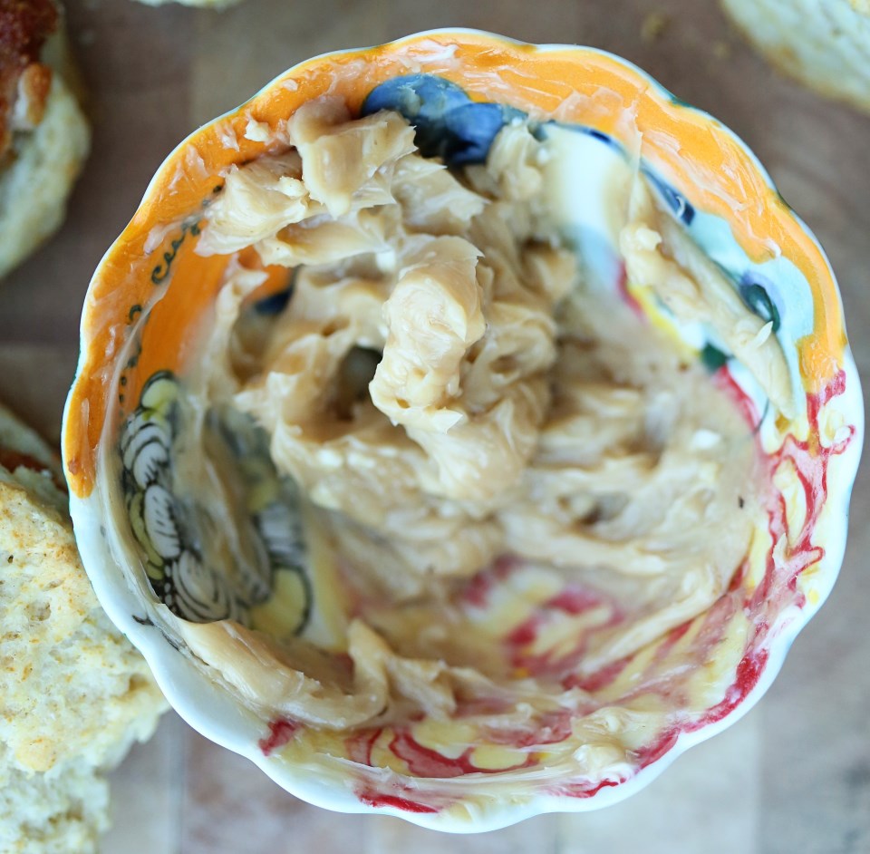 Combine all ingredients until thoroughly incorporated. Spread on biscuits and top with chicken pieces. We also doctored the sandwiches up with a bit of mustard, hot sauce and candied jalapenos, but just the chicken, biscuit and butter are enough.