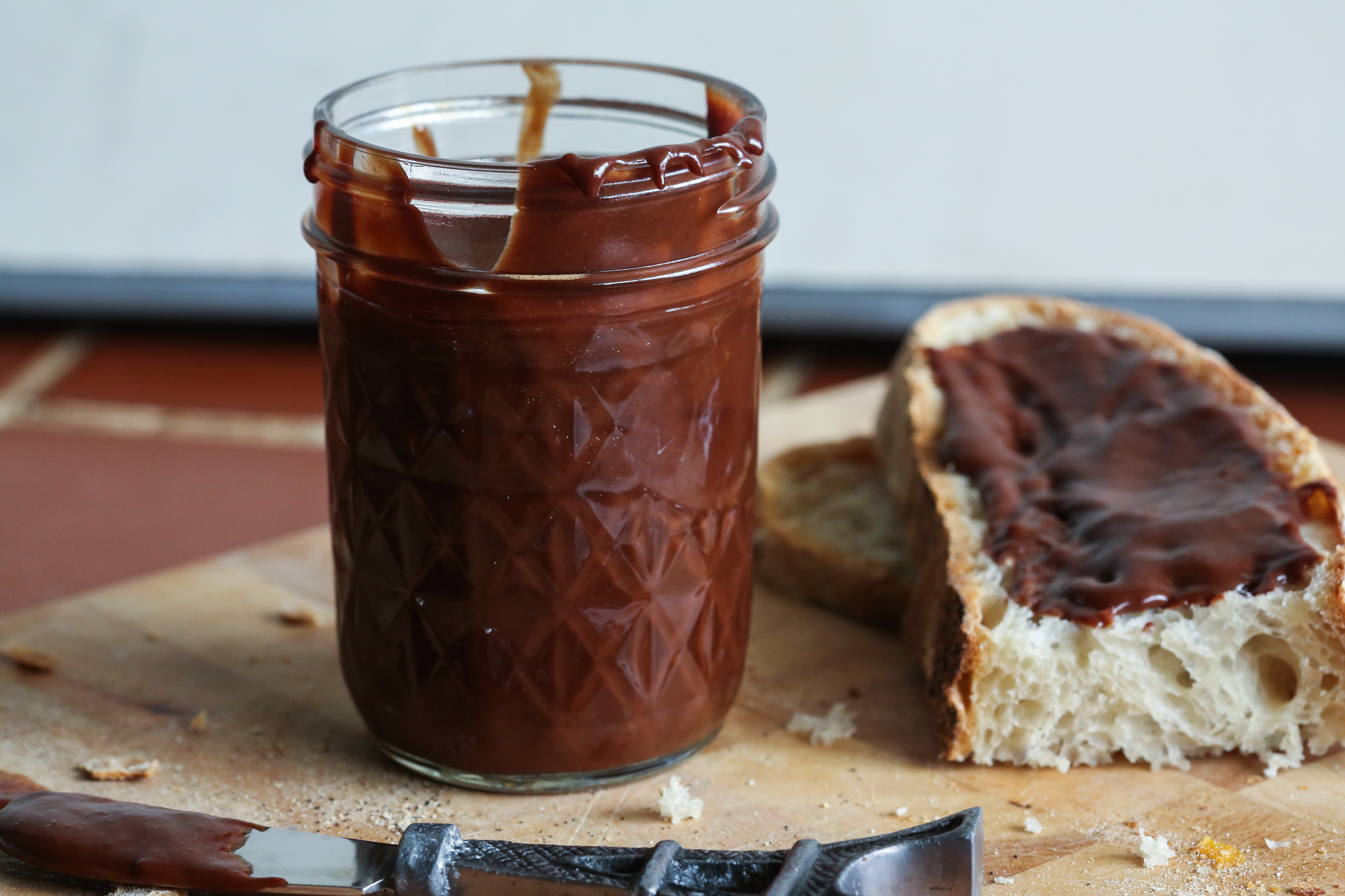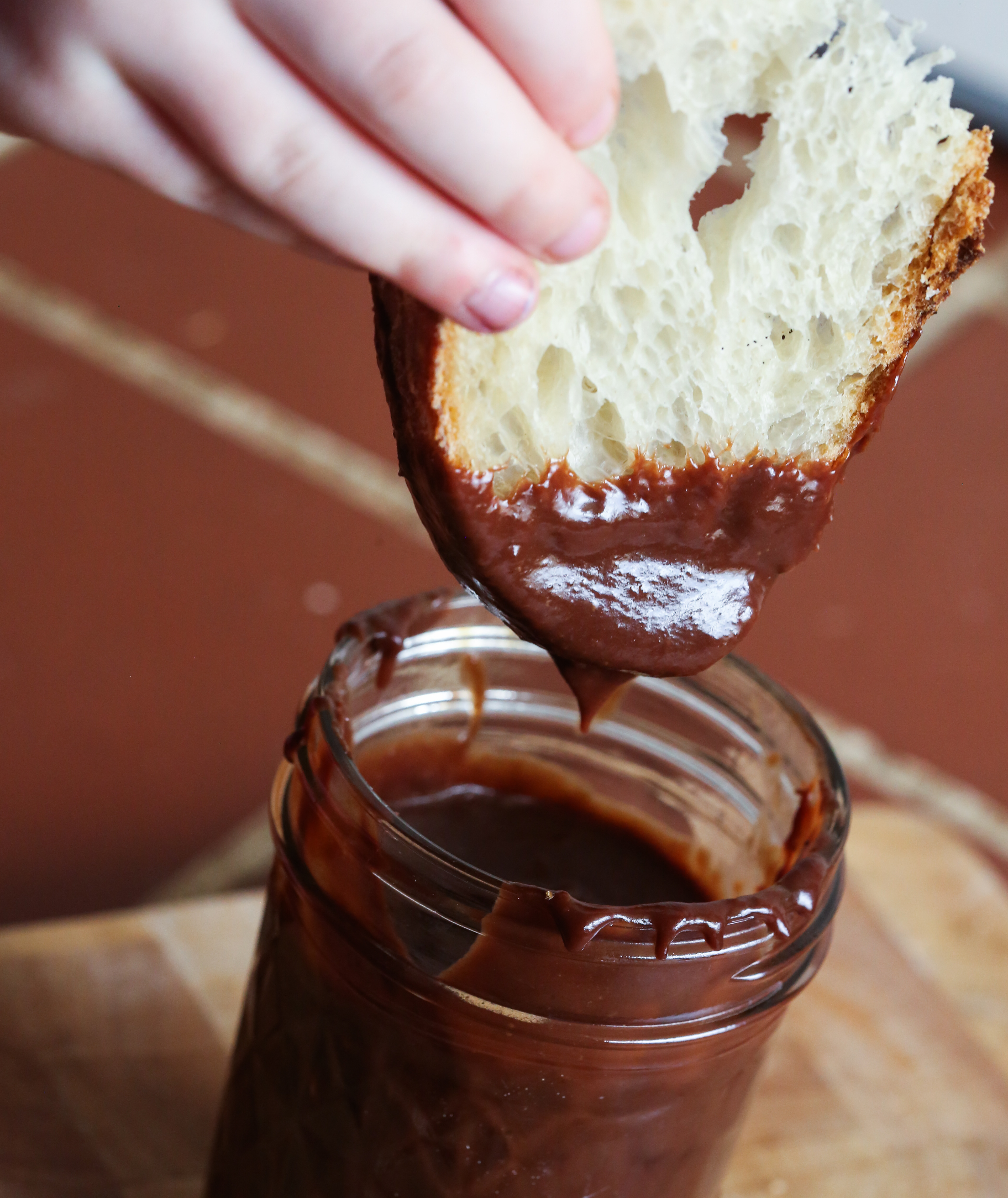 In a large saucepan, combine the bananas, brown sugar and water over medium heat and bring to a boil. Mash up the bananas with a spatula and boil for about 2 minutes, stirring. Remove from heat and stir in the dark chocolate. Pour the banana chocolate mixture into a food processor and blend until completely smooth. Add the butter and blend again. Taste test – add a sprinkle of kosher salt and let it blend once more. Add more salt to your taste. I tend to like my sweets with a salty edge, so I probably added about a half teaspoon when it was all said and done. Pour into jars and store in the fridge. We have ours on bread. I’m not really sure what else you’d need in life than good bread and chocolate.