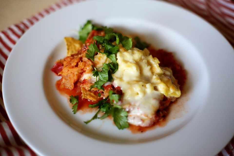 Coarsely puree tomatoes and serrano peppers in a food processor or blender. Heat oil in large saucepan; add onion and sauté until golden, about 7 minutes. Stir in garlic, cook 1 minute, then stir in broth, tomato puree and salt. Heat to boil. Stir in cilantro. Set mixture aside. In a separate pan, heat 2 tablespoons of butter over medium heat and scramble the eggs and a half teaspoon of salt till they’re almost done. Remove from heat. Pour the sauce over the chips; coating them evenly with the sauce. Layer the almost-done scrambled eggs on top of the sauce. Sprinkle with cheese and bake until lightly browned on top and bubbling, about 15 minutes.